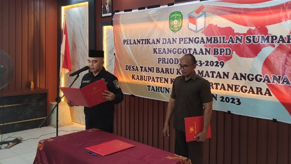 KUTAI KARTANEGARA – Asisten I Bidang Pemerintahan dan Kesejahteraan Rakyat (Pemkesra) Pemerintah Kutai Kartanegara, Akhmad Taufik Hidayat melantik Badan Permusyawaratan Desa (BPD) periode 2023-2029 Desa Tani Baru Kecamatan Anggana, Jumat (27/10/2023).