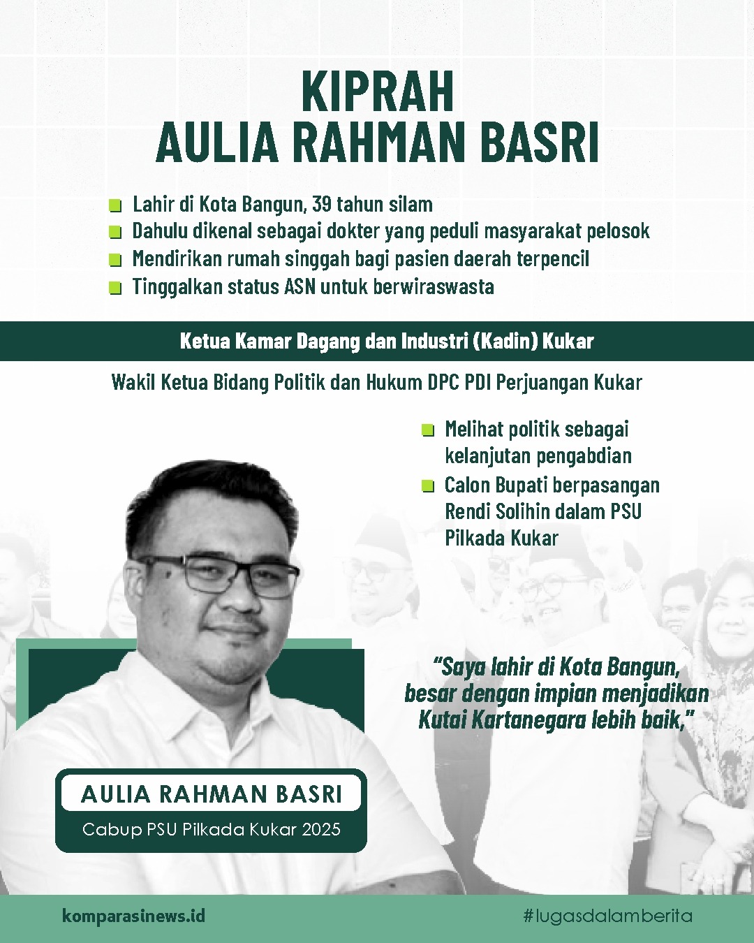 Aulia Rahman Basri, pria 39 tahun ini dahulunya dikenal sebagai dokter aparatur sipil negara (ASN) yang peduli terhadap masyarakat pelosok Kukar. Dengan kepeduliannya itu, dia mendirikan rumah singgah bagi pasien daerah terpencil seperti Muara Muntai yang kesusahan mengakses layanan kesehatan di RSUD Dayaku Raja.