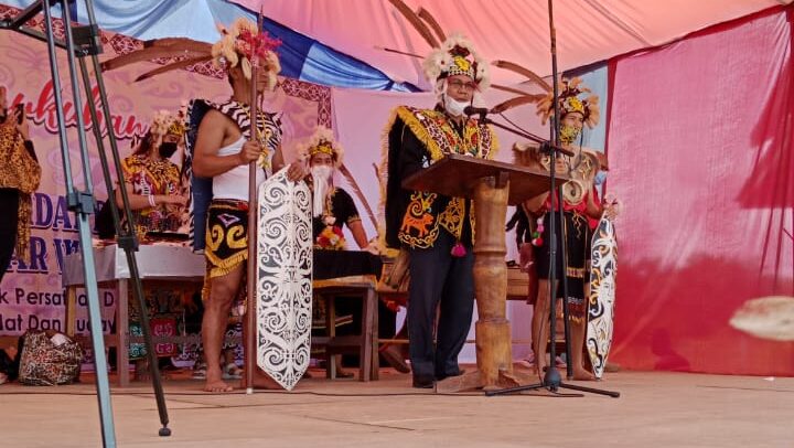 KUTAI KARTANEGARA – Pemasangan bluko atau topi makhota khas suku Dayak menandai pengukuhan M Daleq Jempung Liu sebagai Kepala Adat Besar Pemangku Adat Besar Dayak Wilayah Kecamatan Tabang, Kutai Kartanegara (Kukar) pada Selasa, (22/2/2022). Prosesi tersebut berlangsung khidmat penuh suka cita.