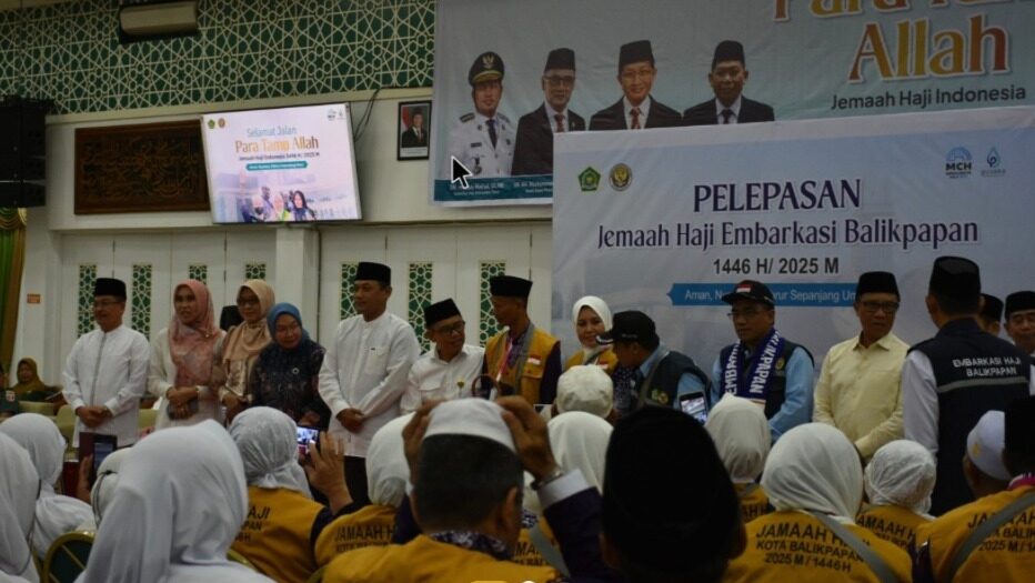 Foto : Para jemaah haji tahun 2025 berkumpul di Embarkasi Balikpapan untuk mengikuti acara pelepasan menuju tanah suci. (DPRD Kaltim)
