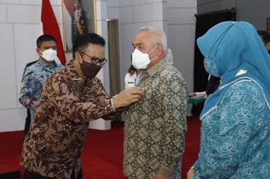 SAMARINDA – Kepala BKKBN RI Hasto Wardoyo menyematkan penghargaan Manggala Karya Kencana kepada Gubernur Kaltim Isran Noor dan Ketua Tim Penggerak Pemberdayaan dan Kesejahteraan Keluarga (TP PKK) Kaltim Norbaiti di Odah Etam Komplek Kantor Gubernur Kaltim, Samarinda, Kamis (21/10/2021).