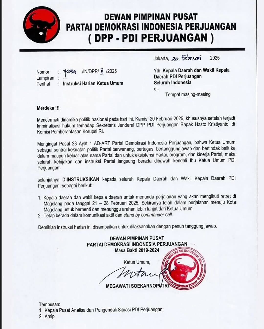 Instruksi itu termuat dalam surat resmi PDIP bernomor 7294/IN/DPP/II/2025 yang ditandatangani Megawati Soekarnoputri pada Kamis (20/2/2025). Instruksi tersebut muncul setelah mencermati dinamika politik nasional yang terjadi pada hari ini, khususnya setelah penahanan Sekretaris Jenderal PDIP Hasto Kristiyanto oleh KPK.