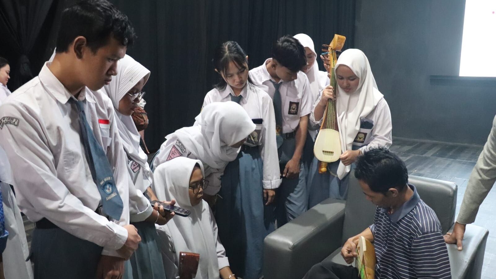 Foto : Suasana belajar interaktif bersama Katal, pengrajin gambus Kutai, yang memperlihatkan proses pembuatan dan teknik memainkan alat musik tradisional kepada pelajar SMA di Samarinda. (Pemprov Kaltim)