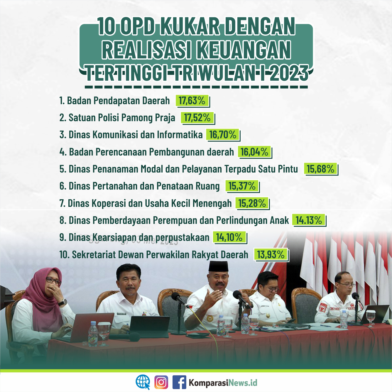 Adapun sepuluh OPD dengan capaian realisasi keuangan tertinggi meliputi Badan Pendapatan Daerah (17,63 persen), Satuan Polisi Pamong Praja (17,52 persen), Dinas Komunikasi dan Informatika (16,70 persen), Badan Perencanaan Pembangunan daerah (16,04 persen), Dinas Penanaman Modal dan Pelayanan Terpadu Satu Pintu (15,68 persen), Dinas Pertanahan dan Penataan Ruang (15,37 persen), Dinas Koperasi dan Usaha Kecil Menengah (15,28 persen). Dinas Pemberdayaan Perempuan dan Perlindungan Anak (14.13 persen), Dinas Kearsiapan dan perpustakaan (14,10 persen) dan Sekretariat Dewan Perwakilan Rakyat Daerah (13,93 persen). (xl)