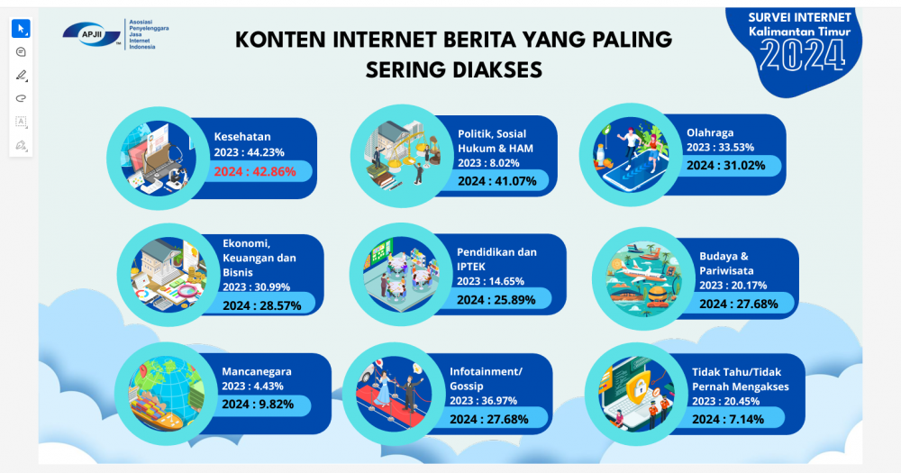Sekretaris APJII Pusat Zulfadly Syam di Samarinda, Rabu (3/4/2024) menerangkan, persentase pengguna internet Kaltim yang mengakses konten kesehatan mencapai 42.86 persen. Sementara yang mengakses konten olahraga sebesar 31.02 persen. Selain dua bidang tersebut, politik sosial, hukum dan HAM juga menjadi konten favorit bagi warganet Kaltim.