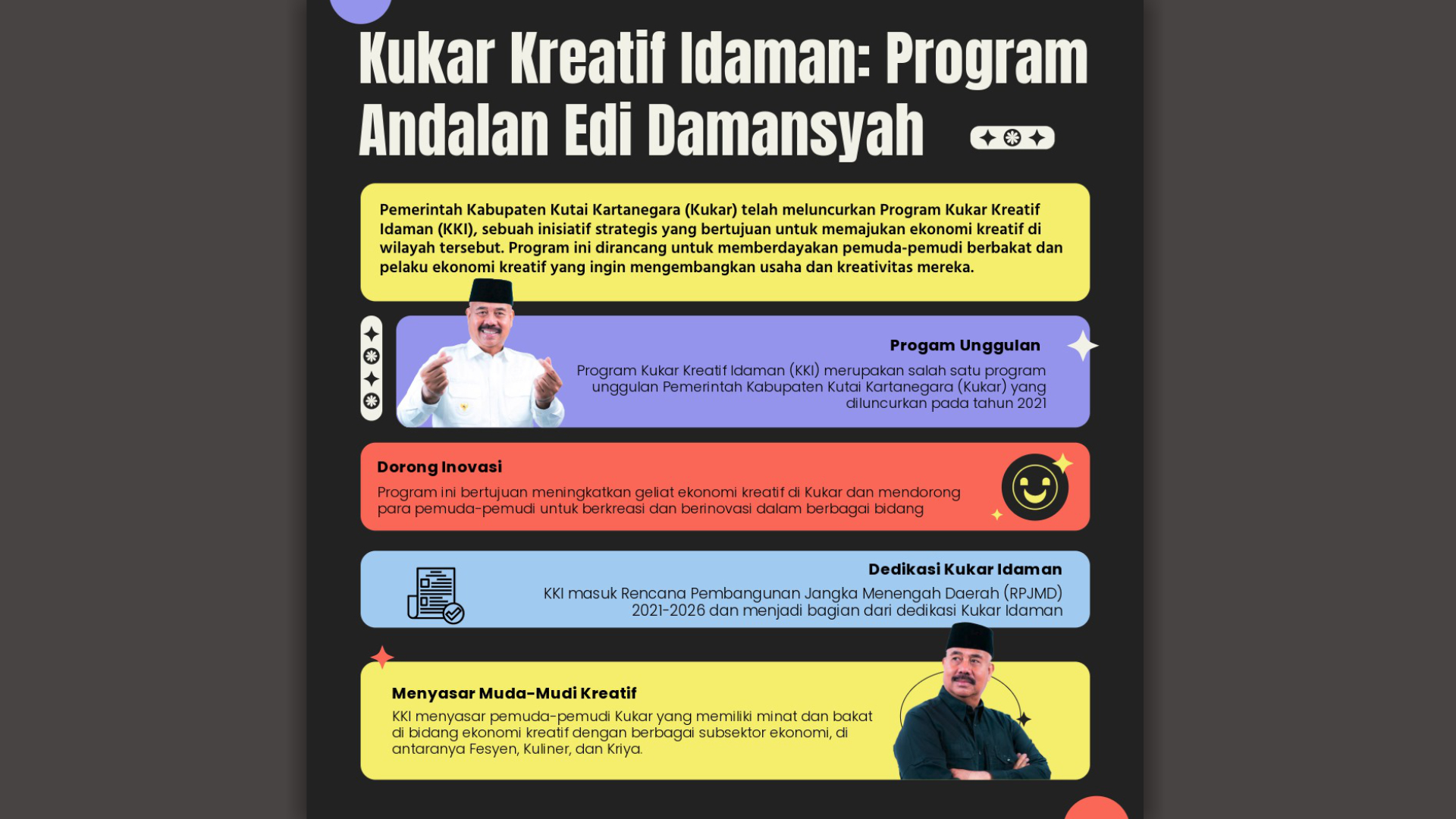Kemajuan ekonomi yang signifikan di Kukar, yang tercermin dalam peningkatan PDRB dan penurunan TPT, tidak terlepas dari inisiatif strategis yang diusung oleh Bupati Edi Damansyah. Salah satu program unggulan yang menjadi katalis penting adalah Program Kukar Kreatif Idaman.