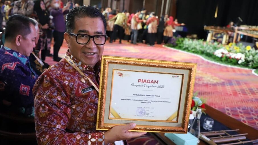 Pj Gubernur Kaltim Akmal Malik memegang piagam penghargaan Anugerah Pengadaan 2023. (istimewa)