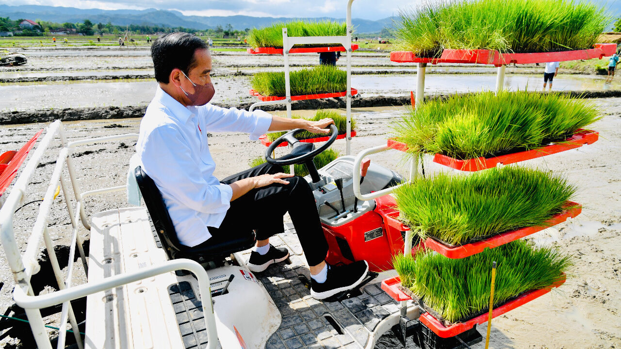 Presiden Jokowi mengendarai mesin tanam padi, di Trenggalek, Jatim, Selasa (30/11/2021) siang. (Foto: BPMI Setpres/Laily Rachev)