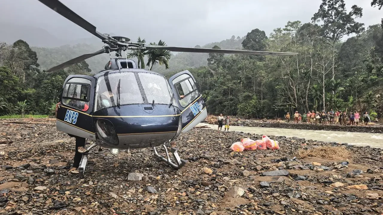 Foto : Helikopter BNPB mendarat di tepi sungai demi antarkan bantuan warga yang terisolir akibat bencana hidrometeorologi di Desa Sihaporas, Kecamatan Pinangsori, Kabupaten Tapanuli Tengah, Sumatra Utara. (BNPB)