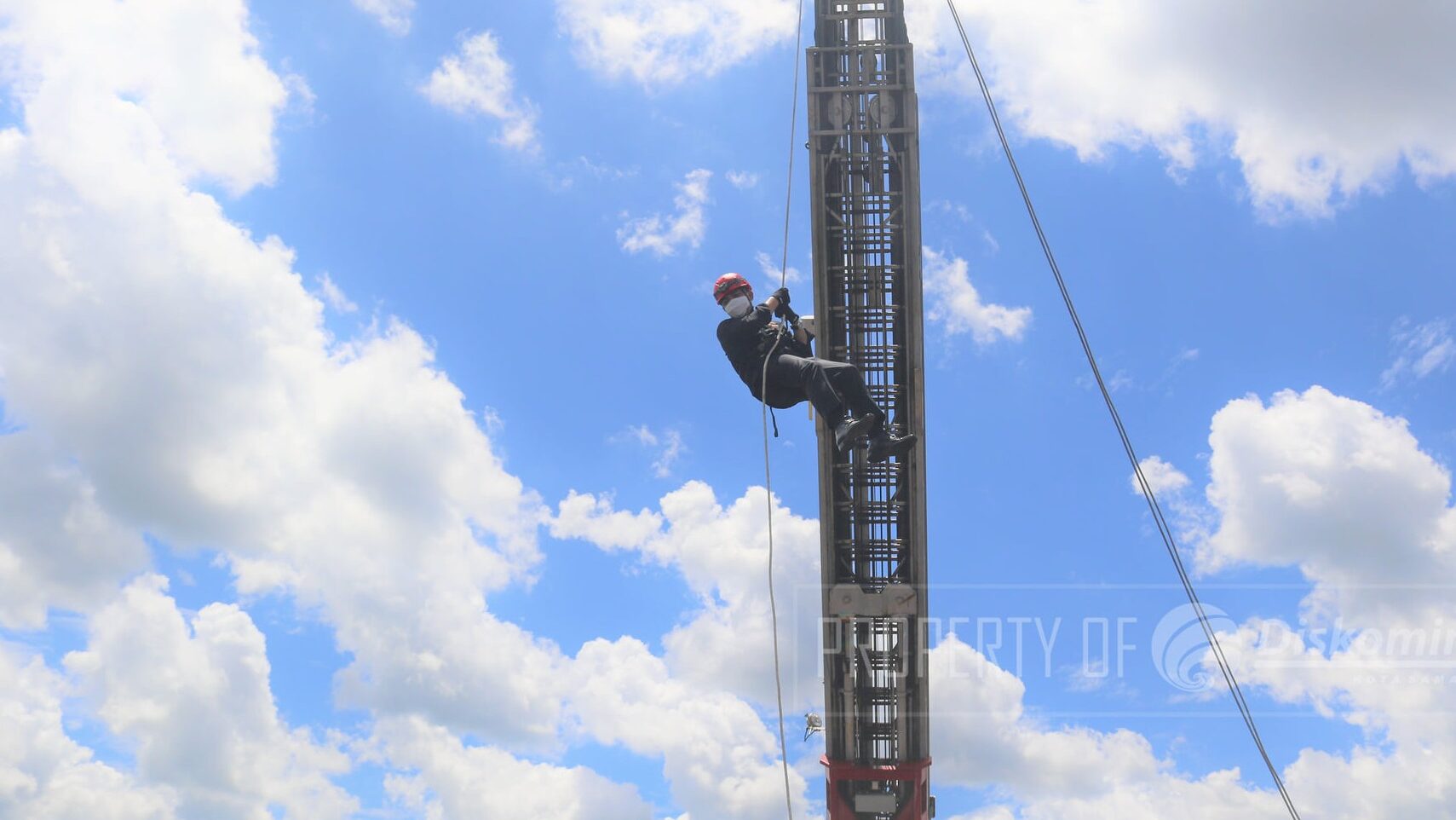 SAMARINDA – Aksi luar biasa dilakukan Wali Kota Samarinda Andi Harun yang terjun dari ketinggian sekitar 25 meter. Orang nomor satu di Kota Tepian ini menggunakan seutas tali atau rapling dari mobil tangga pemadam kebakaran unit jerapah seusai memimpin Apel Siaga dan Fire Drill Pasukan Pemadam Kebakaran.