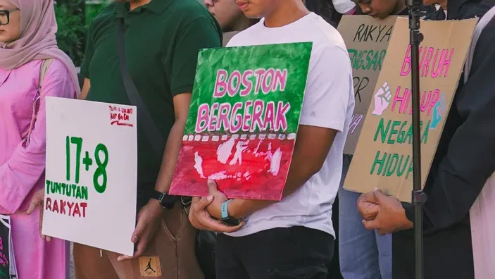 “Kami menyatakan solidaritas atas gerakan rakyat Indonesia, menuntut agar pemerintah tetap melanjutkan usaha pemenuhan tuntutan-tuntutan 17+8 yang belum terpenuhi walaupun sudah melewati tenggat waktu pada Jumat (5/9/2025) lalu,” demikian pernyataan tertulis Boston Bergerak, Minggu (7/9/2025).